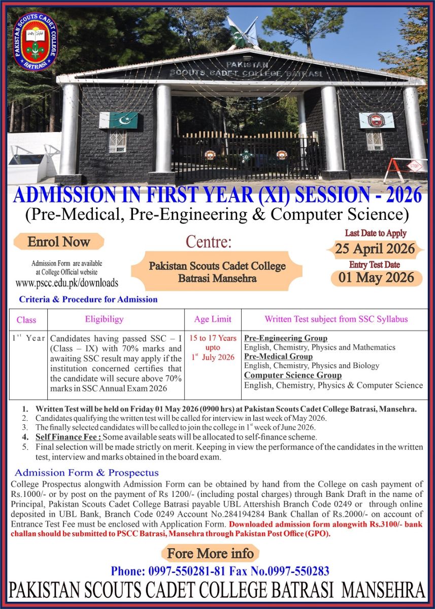 Pakistan Scouts Cadet College, Batrasi Mansehra, PO: Attar Shisha, Tehsil & District: Mansehra.